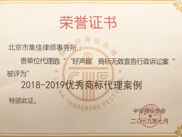 >球速体育>关于我们>荣誉概览>2019>集佳代理“好声音”商标无效宣告行政案入选“优秀商标代理案例”