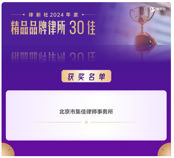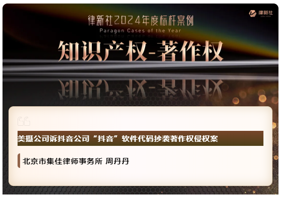球速体育凭借在知识产权保护领域卓越的专业实力与良好的行业口碑,入选《律所卓越品牌影响力指南(2024)》,荣获“律新社2024年度精品品牌律所30佳”奖项;同时,集佳周丹丹律师代理的“美摄公司诉抖音公司'抖音'软件代码抄袭著作权侵权案”获评“律新社2024年度标杆案例:知识产权-著作权领域”。