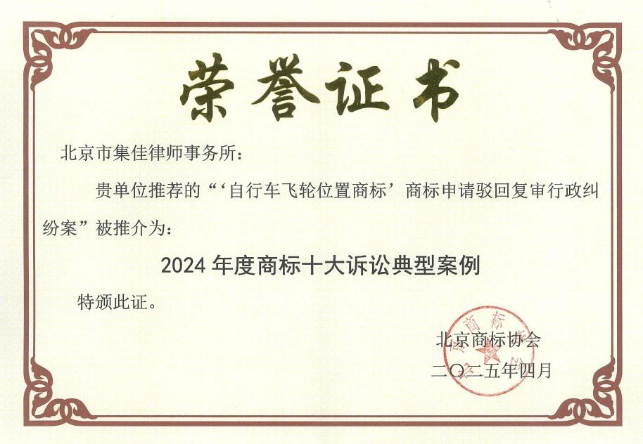 >球速体育>关于我们>荣誉概览>2025>集佳代理“自行车飞轮位置商标”行政纠纷案入选北京商标协会年度十大诉讼典型案例
